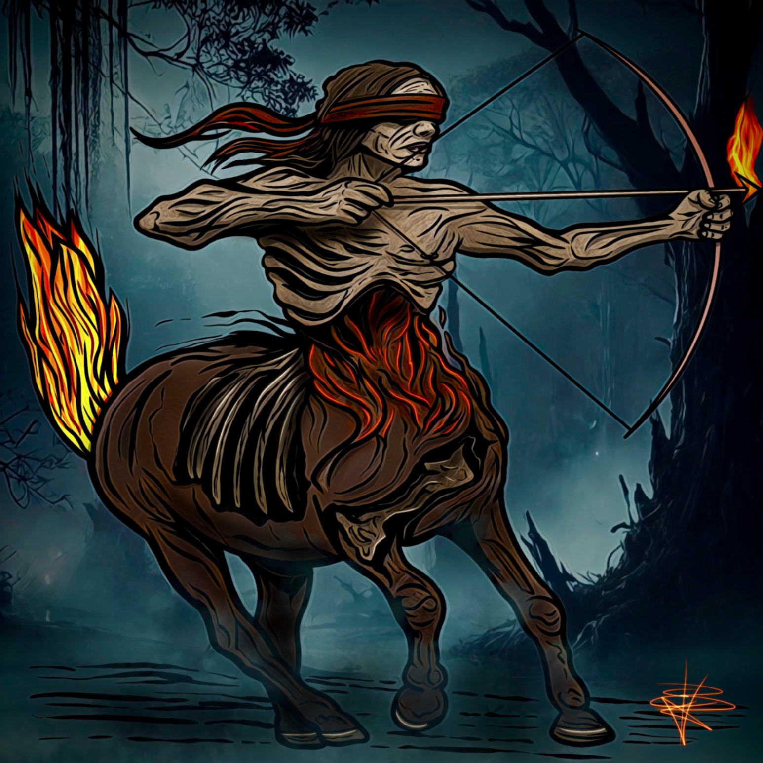 Flame-bound tail and arrow bright,