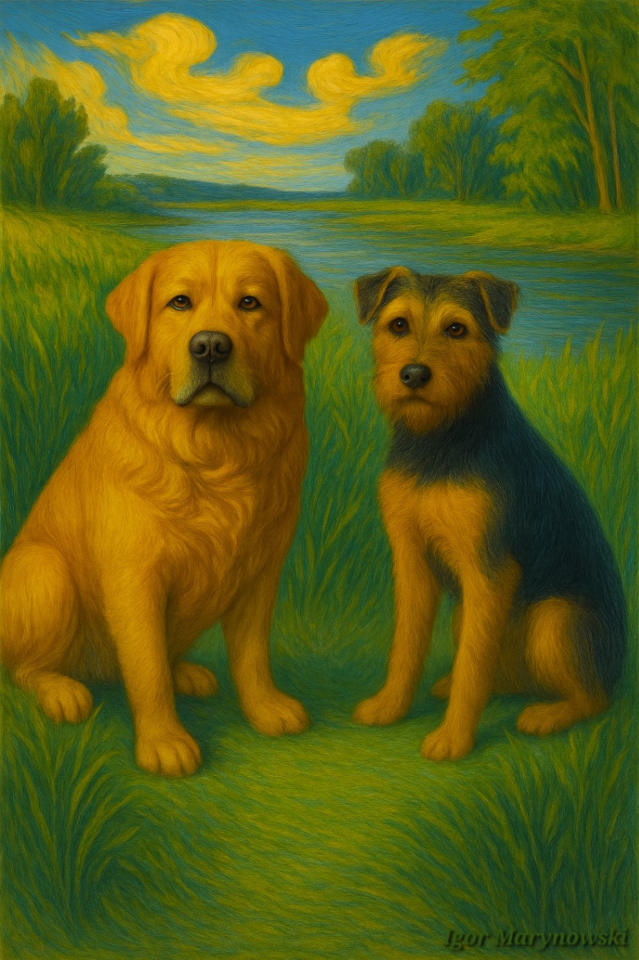 two dogs guard the lakeside peace,