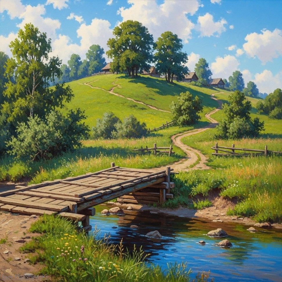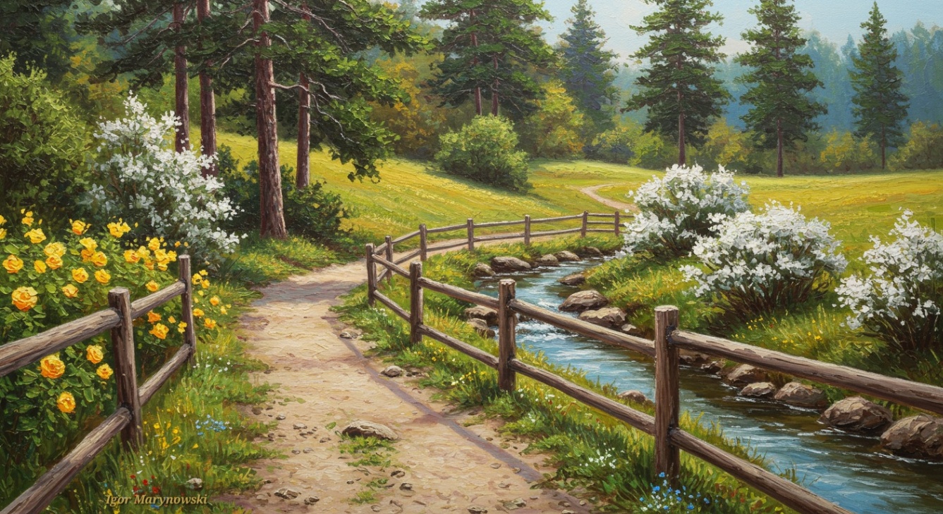 A stream whispers peacefully, its waters gleam,