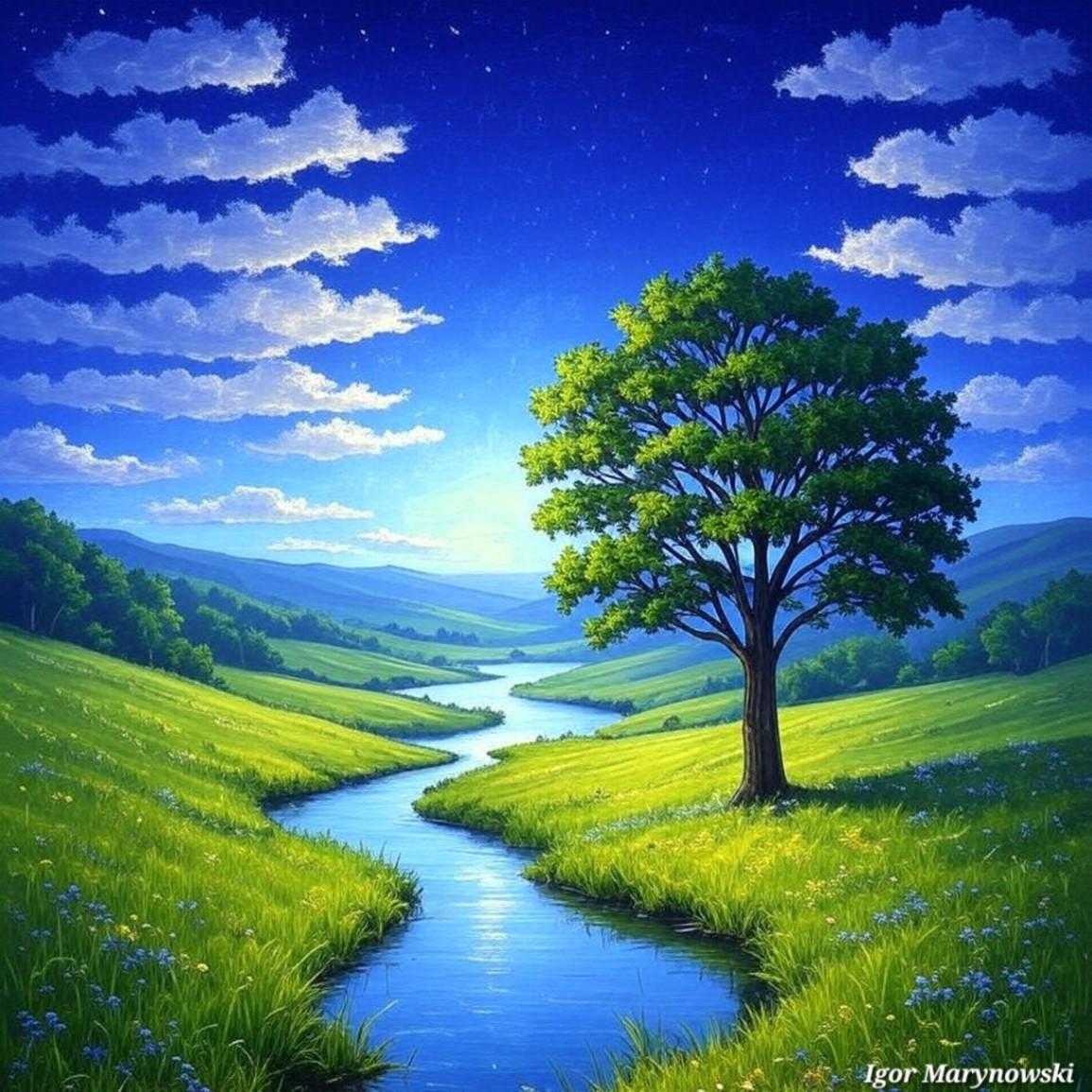Dreamy tree by stream,