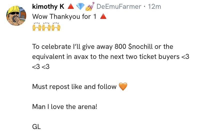 To celebrate I’ll give away 800 $nochill or the equivalent in avax to the next two ticket buyers <3
