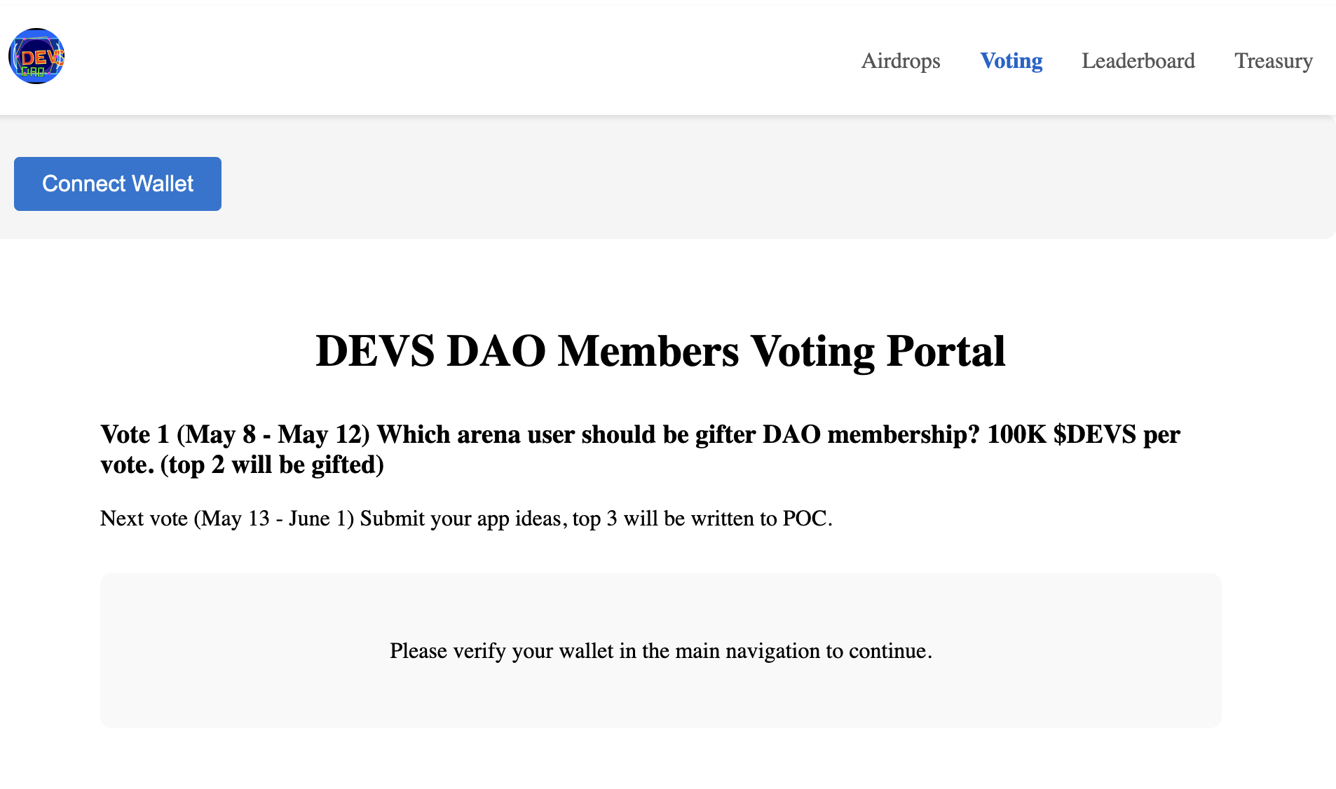 100K $DEVs per vote, vote as much as you like. All Funds go to the Treasury, visible on last tab :)